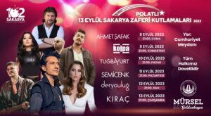 Geçtiğimiz yıllarda düzenlenen Sakarya Zaferi Kutlamalarında gerçekleştirdiği görkemli programlarla Anadolu Bozkırının Parlayan Yıldızı Polatlı’nın adını tüm Türkiye’ye duyuran Polatlı Belediyesi 13 Eylül tarihine kadar düzenleyeceği etkinlikler ve konserlerle birbirinden ünlü sanatçıları Cumhuriyet Meydanı’nda yine Polatlılılarla buluşturacak. Bir hafta boyunca her akşam Cumhuriyet Meydanı’nda düzenlenecek olan 102. Yıl Halk Konserleri kapsamında; 8 Eylül Cuma Günü Ahmet Şafak, 9 Eylül Cumartesi Günü Kolpa, 10 Eylül Pazar Günü Tuğba Yurt, 11 Eylül Pazartesi Günü Semicenk, 12 Eylül Salı Günü Derya Uluğ ve 13 Eylül Çarşamba Günü Kıraç Polatlılılar için sahne alacak.