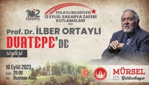 Sakarya Zaferi Kutlamaları kapsamında Polatlı Belediye Başkanı Mürsel Yıldızkaya’nın özel davetlisi olarak Polatlı’ya gelecek olan Prof. Dr. İlber Ortaylı; 10 Eylül Pazar Günü Saat 20.00’da Duatepe’de düzenlenecek olan özel söyleşide Polatlılılarla buluşacak. Didem Dilara Duman ve Barış Akpınar’ın seslendireceği kahramanlık türküleriyle başlayacak olan anlamlı gecede Halk Oyunları ekipleri sahne alacak. Prof. Dr. İlber Ortaylı’nın anlatımıyla düzenlenecek özel söyleşide Polatlılılar savaşın en kritik anlarına şahit olan Duatepe’de ‘Melhame-i Kübra’ (Büyük Kanlı Savaş) olarak adlandırılan Sakarya Meydan Muharebesi’nin önemi ve bilinmeyen yönlerine şahit olacak. Polatlı Belediyesi tarafından söyleşiye katılmak isteyen vatandaşlar için Cumhuriyet Meydanı’ndan otobüsler kaldırılacak.